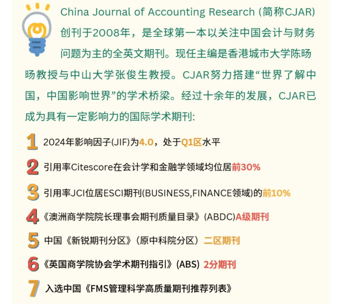 这不仅是对CJAR国际学术影响力与办刊质量的重要认可,也将进一步提升CJAR在全球商科与会计金融学术共同体中的可见度与学术声誉;同时也是太阳成推进科研平台建设与学术出版国际化的重要成果。